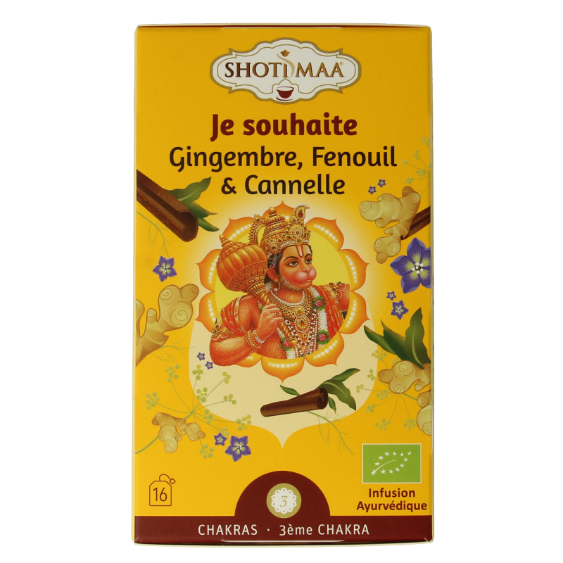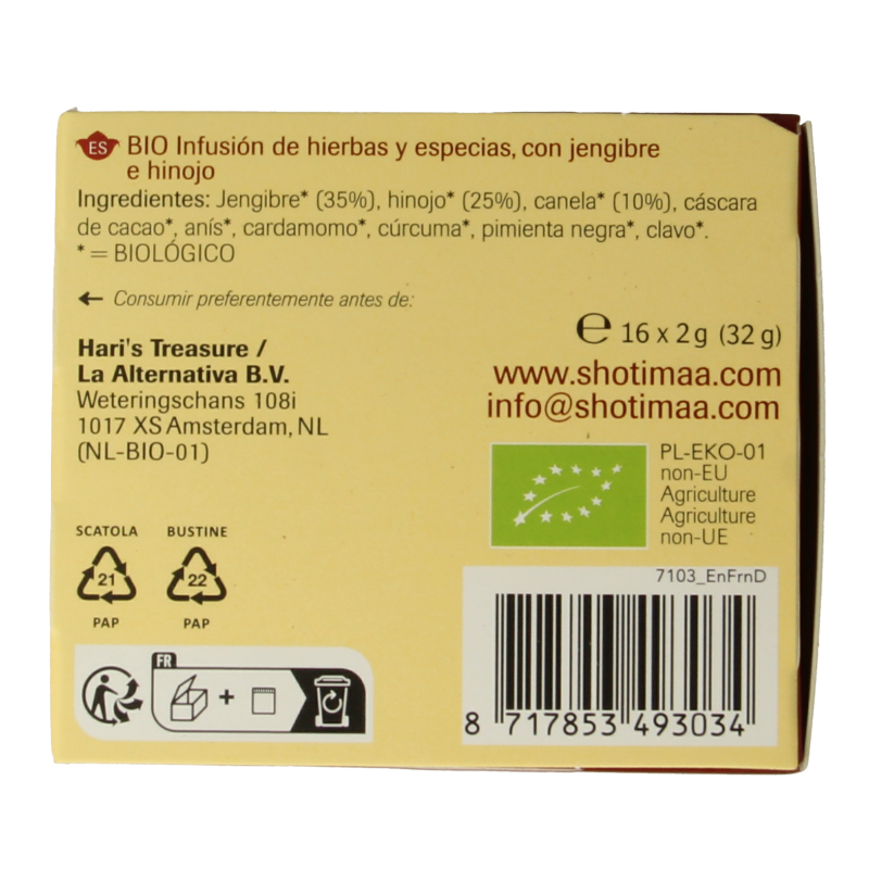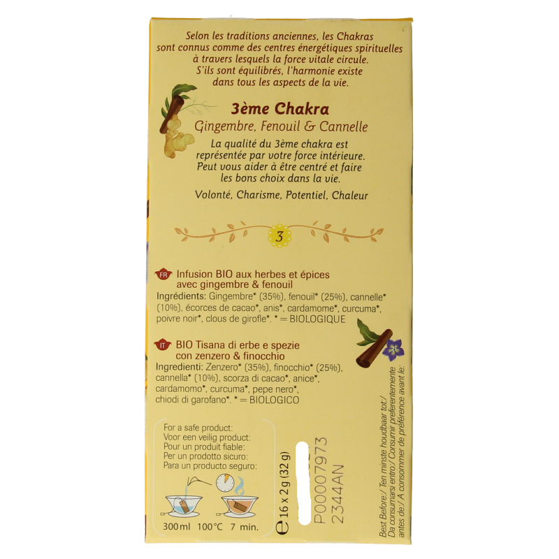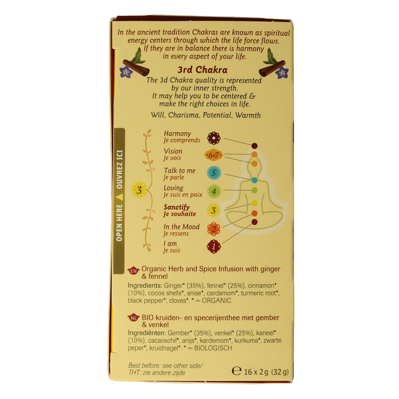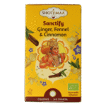Gember* (35%), venkel* (25%), kaneel* (10%), cacaoschil*, anijs*, kardemom*, kurkuma*, zwarte peper*, kruidnagel*.