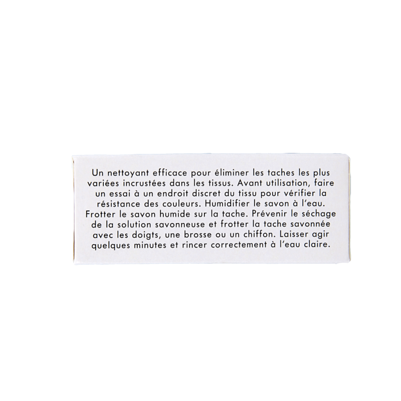 Voor het gebruik de stof op een onopvallende plaats testen op kleurechtheid. Maak de zeep met water nat. Bestrijk de vlek met de natte zeep. Voorkom indroging van de zeepoplossing en wrijf deze in met de vingers, borstel of doek. Even in laten trekken en vervolgens grondig spoelen met schoon water.