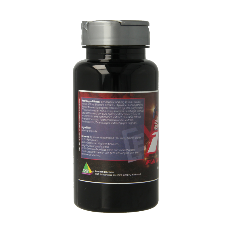 650 mg Citrus Paradisi-extract, Citrus Sinensis-extract, L-tyrosine, Ashwagandha, Groene thee-extract (gestandariseerd op 98% polyfenolen,75% catechinen en 45% EGCG), Garcinia cambogia-extract (gestandariseerd om 50% hydroxycitroenzuur (HCA) te bevatten), Groene koffiebonen-extract, Guarana-extract, Berendruif-extract, Paardenbloemwortel-extract, Gemberwortel, Zwarte peper-extract (piper negrum).