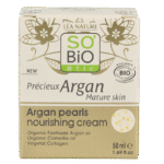 Deze luxe anti-aging gezichtcrème voor de rijpere huid bevat unieke parels van pure argan olie die versmelten zodra de crème wordt aangebracht. Hierdoor zorgt deze rijke crème voor optimale voeding voor de normale tot droge huid. Dankzij de toevoeging van camelia olie wordt de huidstructuur verbetert en dankzij een plantaardige collageen booster op basis van algen wordt de huid verstevigt. Bevat vitamine E die fungeert als krachtige anti-oxidant. SO BiO étic Perles d”Argan dagcrème is vegan en 99% natuurlijk van samenstelling en is vrij van parabenen, siliconen, microplastics, minerale oliën of synthetisch parfum. De biologische argan olie in deze crème wordt bovendien fairtrade geproduceerd. Cosmebio/Ecocert Cosmos Organic gecertificeerd.