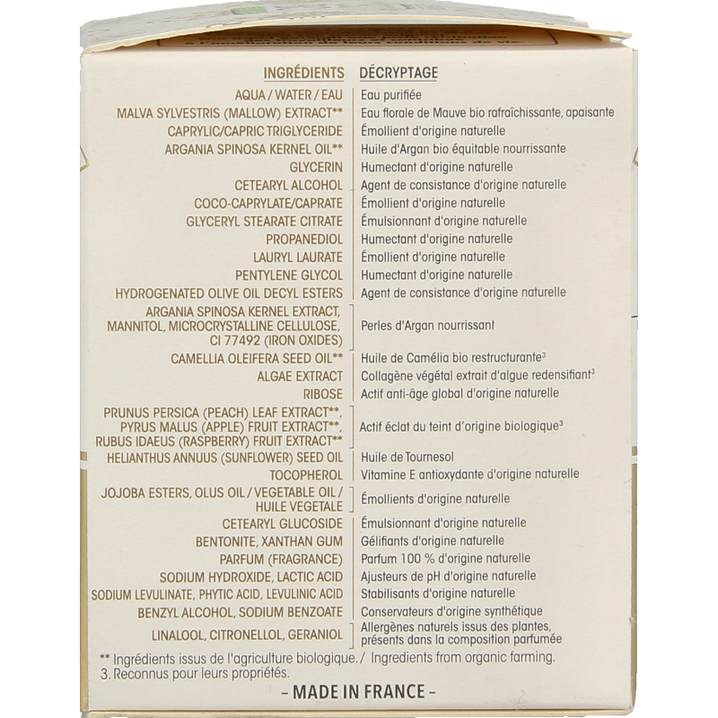 Aqua/water/eau, malva sylvestris (mallow) extract**, caprylic/capric triglyceride, argania spinosa kernel oil**, glycerin, cetearyl alcohol, coco-caprylate/caprate, glyceryl stearate citrate, propanediol, lauryl laurate, pentylene glycol, hydrogenated olive oil decyl esters, argania spinosa kernel extract, mannitol, microcrystalline cellulose, CI 77492 (iron oxides), camellia oleifera seed oil**, algae extract, ribose, prunus persica (peach) leaf extract**, pyrus malus (apple) fruit extract**, robus idaeus (raspberry) fruit extract**, helianthus annuus (sunflower) seed oil, tocopherol, jojoba esters, olus oil/vegetable oil/ huile vegetale, cetearyl glucoside, bentonite, xanthan gum, parfum (fragrance), sodium hydroxide, lactic acid, sodium levulinate, phytic acid, levulinic acid, benzyl alcohol, sodium benzoate, LINALOOL, CITRONELLOL, GERANIOL.