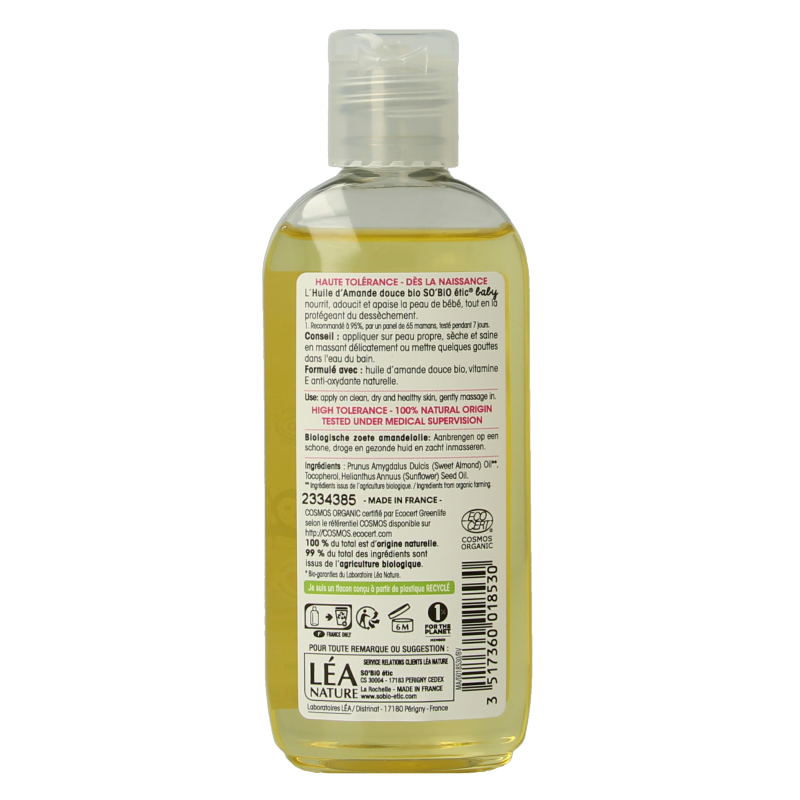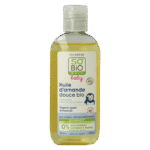 SO”BiO etic Baby Sweet Almond Oil voedt, verzacht en kalmeert de kwetsbare babyhuid. Het beschermt tegen uitdroging en behoudt de zachtheid van de huid. Samengesteld met zoete amandelolie en natuurlijke antioxidant vitamine E. Perfect voor een massage of om de tere babyhuid te beschermen tegen uitdroging in koude maanden. De volledige serie is hypoallergeen, extra geschikt voor de gevoelige (baby)huid en kan daarmee dus niet irriteren zoals gangbare babycare dit wel kan doen. Dankzij de 100% plantaardige flacon zorgt SO’BiO étic ervoor dat de planeet ook voor jouw kleintje behouden blijft. Dit product is vegan van samenstelling, vrij van microplastics en Cosmebio/Ecocert gecertificeerd.
