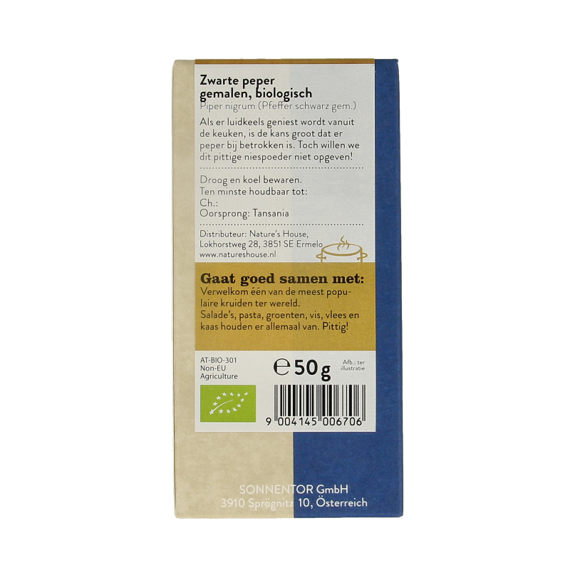 Peper zwart gemalen bioSonnentor Peper zwart gemalen bio IngrediëntenZwarte peper (Piper nigrum)*. *Biologisch BewarenDroog en koel bewaren. Fabrikant / DistributeurNature”s House, Lokhorstweg 28, 3851 SE Ermelo