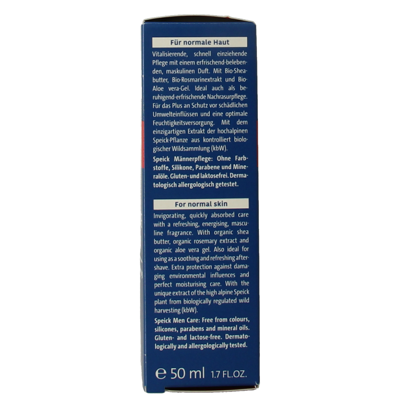 Verkwikkende, snel intrekkende verzorging met een verfrissende, verkwikkende, mannelijke geur. Voor de normale en gevoelige huid. Met biologische sheaboter, biologische rozemarijnextract en biologische Aloë vera-gel. Ook ideaal om te gebruiken als verzachtende en verfrissende aftershave. Extra bescherming tegen schadelijke invloeden van buitenaf en perfecte vochtinbrengende verzorging. Met het unieke extract van de hoogalpiene Speick-plant uit biologisch gereguleerde wilde oogst (kbW).