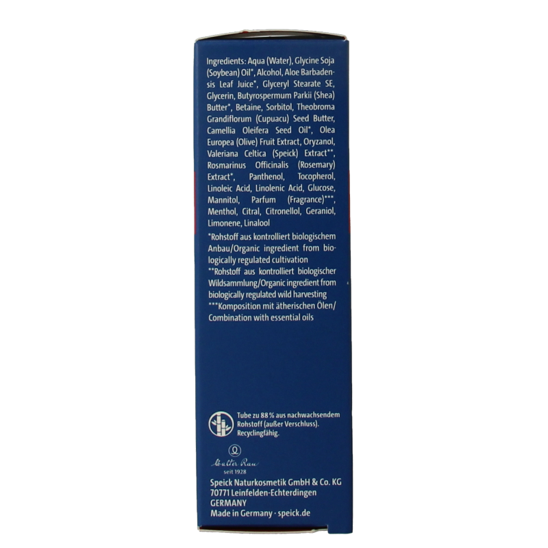 Aqua (Water), Glycine Soja (Soybean) Oil, Alcohol, Aloe Barbadensis Leaf Juice, Glyceryl Stearate SE, Glycerin, Butyrospermum Parkii (Shea) Butter, Betaine, Sorbitol, Theobroma Grandiflorum (Cupuacu) Seed Butter, Camellia Oleifera Seed Oil, Olea Europaea (Olive) Fruit Extract, Oryzanol, Valeriana Celtica (Speick) Extract, Rosmarinus Officinalis (Rosemary) Leaf Extract, Panthenol, Tocopherol, Linoleic Acid, Linolenic Acid, Glucose, Mannitol, Parfum (Fragrance), Menthol, Citral, Citronellol, Geraniol, Limonene, Linalool