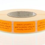 Oranje sticker met zwarte tekst