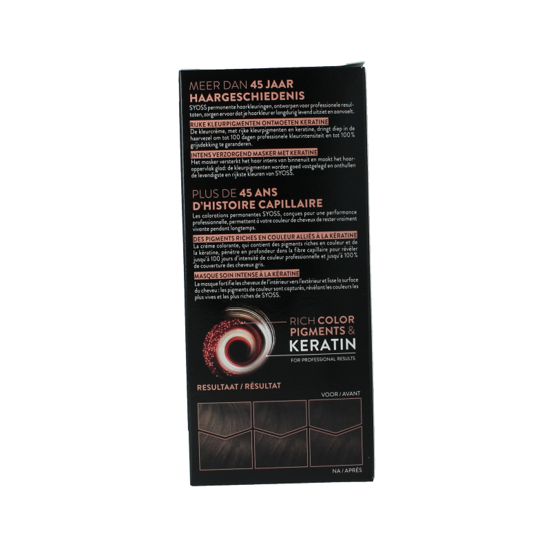 De permanente kleuringen van SYOSS zijn ontworpen voor professionele resultaten en zorgen ervoor dat uw haarkleur er langdurig levendig uitziet en aanvoelt.