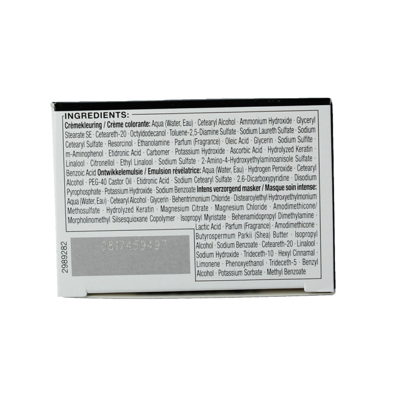 Aqua (Water, Eau), Cetearyl Alcohol, Ammonium Hydroxide, Glyceryl Stearate SE, Toluene-2,5-Diamine Sulfate, Ceteareth-20, Octyldodecanol, Sodium Laureth Sulfate, Resorcinol, Sodium Cetearyl Sulfate, Ethanolamine, Parfum (Fragrance), m-Aminophenol, Oleic Acid, Glycerin, Sodium Sulfite, Etidronic Acid, Carbomer, 2-Amino-4-Hydroxyethylaminoanisole Sulfate, Potassium Hydroxide, Ascorbic Acid, Hydrolyzed Keratin, Linalool, Citronellol, Ethyl Linalool, Sodium Sulfate, Benzoic Acid