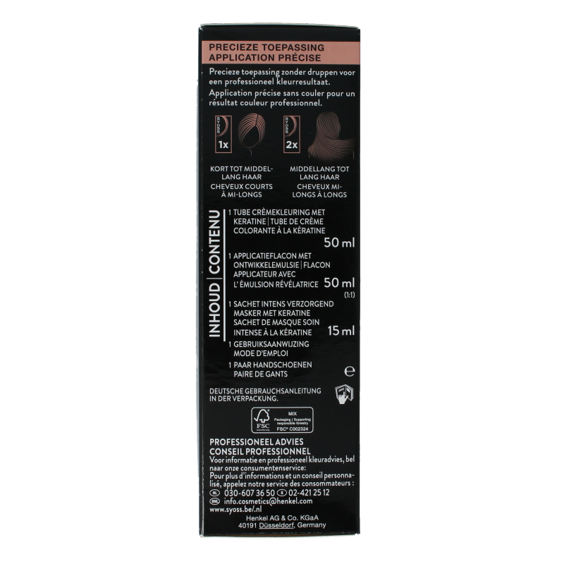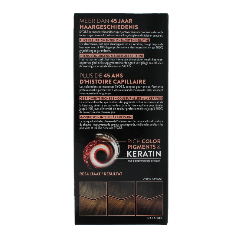De permanente kleuringen van SYOSS zijn ontworpen voor professionele resultaten en zorgen ervoor dat uw haarkleur er langdurig levendig uitziet en aanvoelt.