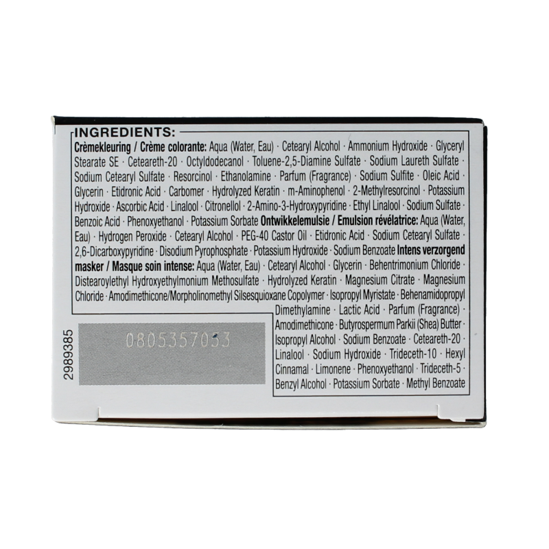 Aqua (Water, Eau), Cetearyl Alcohol, Ammonium Hydroxide, Glyceryl Stearate SE, Ceteareth-20, Octyldodecanol, Toluene-2,5-Diamine Sulfate, Sodium Laureth Sulfate, Sodium Cetearyl Sulfate, Resorcinol, Ethanolamine, Parfum (Fragrance), Sodium Sulfite, Oleic Acid, Glycerin, Etidronic Acid, Carbomer, Hydrolyzed Keratin, m-Aminophenol, 2-Methylresorcinol, Potassium Hydroxide, Ascorbic Acid, Linalool, Citronellol, 2-Amino-3-Hydroxypyridine, Ethyl Linalool, Sodium Sulfate, Benzoic Acid, Phenoxyethanol, Potassium Sorbate