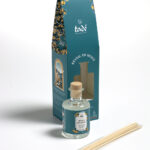 Inhoud van de doos: 1 glazen parfumflesje van 100ml + 5 rotanstokjes.
