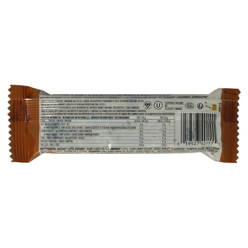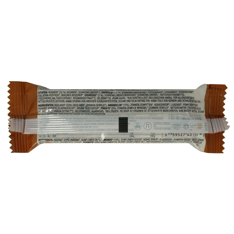 Rozijnen (22%)* (rozijnen*, zonnebloemolie*), AMANDELEN 15%, zonnebloempitten*, agavesiroop*, lijnzaad*, pompoenpitten*, krokant gepofte zilvervliesrijst*, bruine rijstsiroop*, PINDA”S* 3%, zonnebloemolie mengsel* (zonnebloemolie*, antioxidanten (tofocerfolrijk extract, rozemarijn extract*), geleermiddel (agar agar)