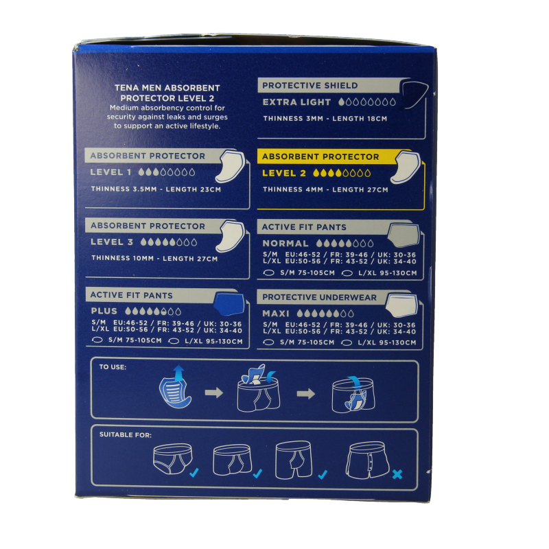 TENA Men Level 2 is speciaal ontworpen voor het mannenlichaam, zodat mannen zonder belemmering hun dagelijkse activiteiten kunnen uitvoeren. TENA Men biedt de zekerheid die mannen nodig hebben, hoe actief ze ook zijn. Level 2 is een perfecte keuze als je af en toe enkele druppels of kleine scheutjes urine verliest.