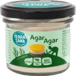 Agar-agar is een biologisch bind- en geleermiddel met een enorme bindkracht. Je kunt het vergelijken met gelatine, maar agar-agar is nóg krachtiger en bovendien 100% vegan. Agar-agar wordt gemaakt van 100% rood zeewier, ook wel kanten genoemd. Je kunt er heerlijke vegan cheesecakes of (suikervrije) jelly mee maken. Agar-agar moet je altijd pas toevoegen als je vloeistof warm is, anders kunnen er klontjes ontstaan. Omdat het al geleert bij kamertemperatuur, is het belangrijk om snel te werken!