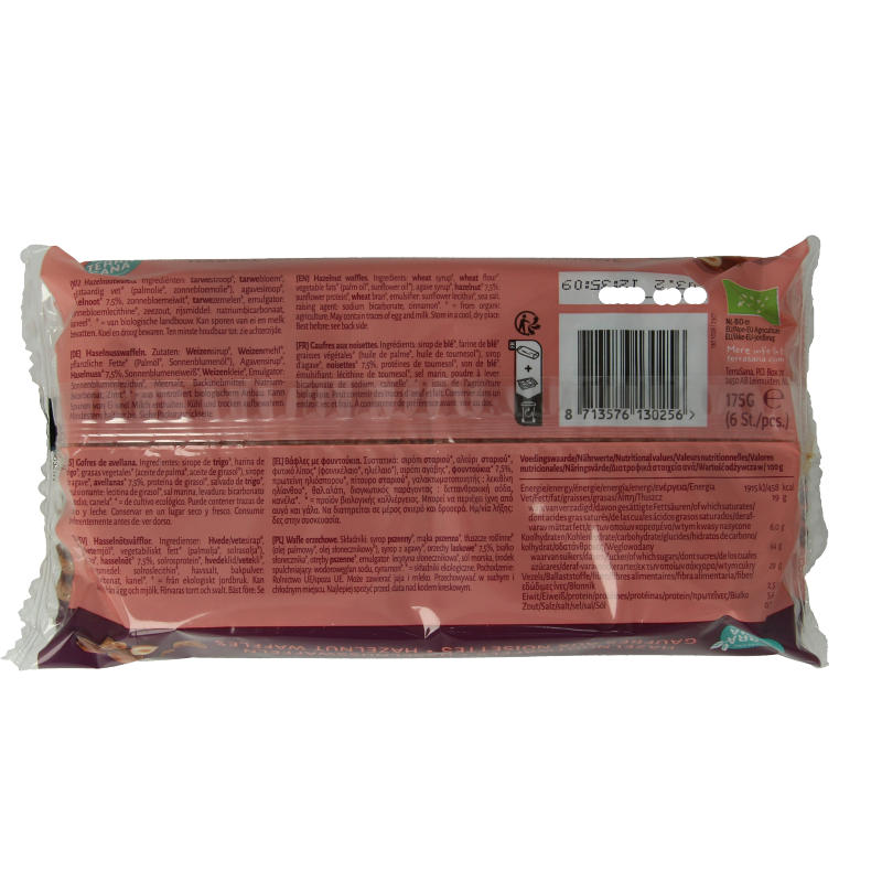 TARWEstroop*, TARWEbloem*, plantaardig vet* (palmolie*, zonnebloemolie*), agavesiroop*, HAZELNOOT* 7,5%, zonnebloemeiwit*, TARWEzemelen*, emulgator: zonnebloemlecithine*, zeezout, rijsmiddel: natriumbicarbonaat, kaneel*.