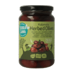 Deze zwartpaarse Griekse olijven zijn heerlijk sappig van structuur en rijk van smaak. Ze zijn al heerlijk op zichzelf, maar de kruidenolie geeft ze nét die extra diepe smaak. Om heerlijk biologisch van te genieten. Lekker als borrelhapje of amuse.
