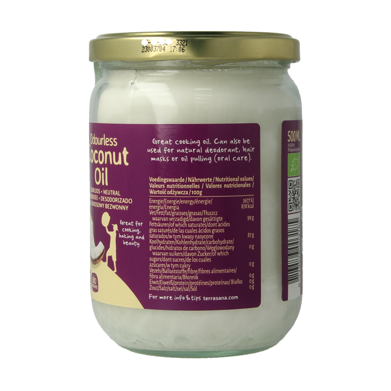 Dit is een biologische kokosolie waar je heerlijk mee kokkerelt, (roer)bakt en zelfs frituurt. Kokosolie wordt vloeibaar bij circa 25°C en kan erg goed tegen hoge temperaturen. Geurloze kokosolie past overal bij, want de geur en smaak van kokos is eruit gehaald. Dit gebeurt zonder toevoegingen of chemische processen. Wist je dat kokosolie een duurzaam product is? We gebruiken ieder onderdeel van de kokosnoot en gooien niets weg. Met deze kokosolie haal je biologische topkwaliteit in huis!