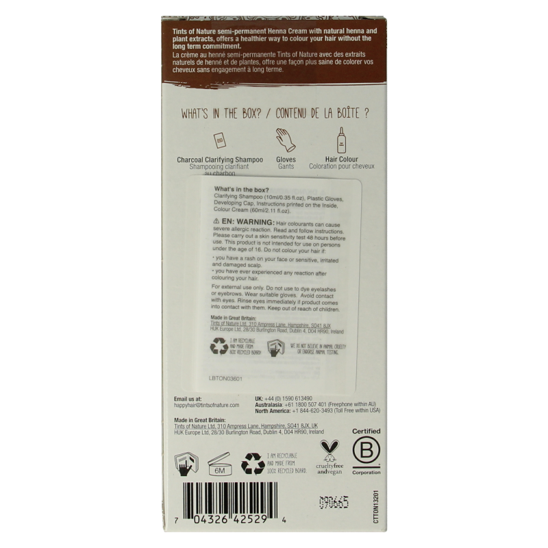 Chloride, Parfum (100% natural), Polyquaternium-10, Basic Blue 99, Ethylhexylglycerin, Tocopherol, Limonene, Basic Brown 16, Lawsonia Inermis (Henna) Leaf Extract, Aloe