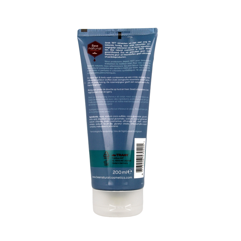 In deze hair & body wash combineren we een milde reiniging met natuurlijke actieve stoffen zoals biologische essentiële rozemarijnolie en onze honing. De rozemarijngeur geeft een aangenaam vitaliserend gevoel!