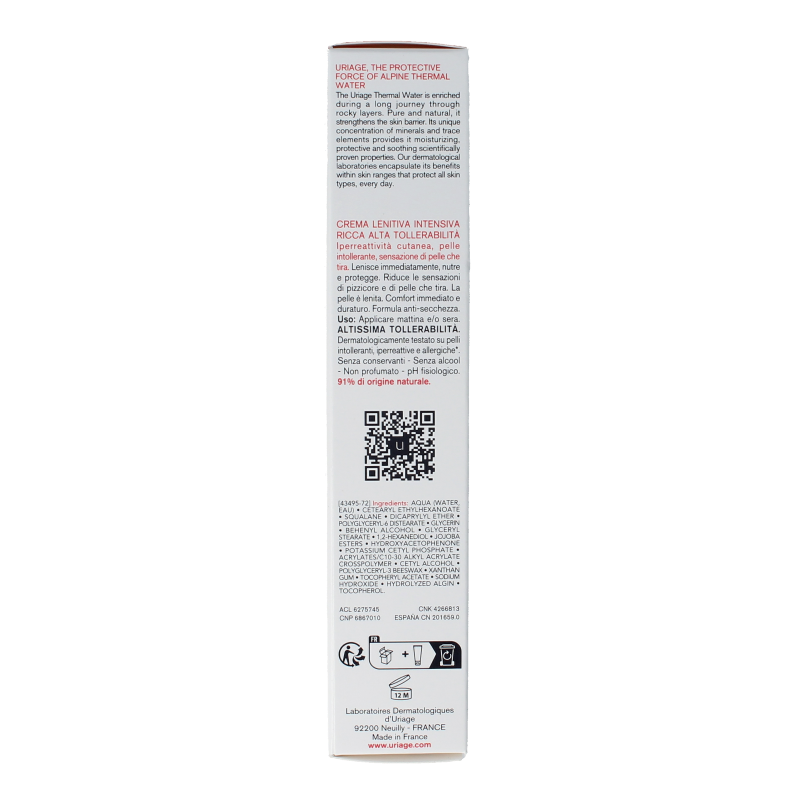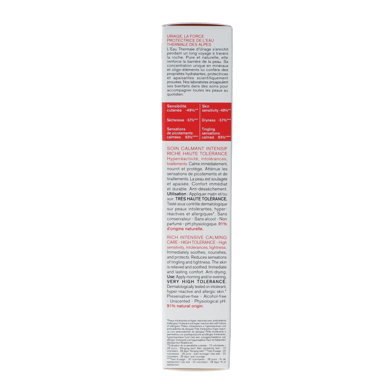 De formule met 3 werkzame ingrediënten van natuurlijke oorsprong [Thermaal Water van Uriage + Plantaardig squalaan + Algenpolyuroniden] versterkt de huidbarrière en verhoogt haar tolerantiedrempel. Zo helpt ze het geïrriteerde, prikkende, verhitte en/of trekkerige gevoel binnen de perken te houden.