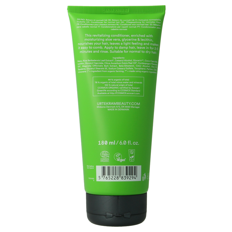 Urtekram aloë vera conditioner regenereert het haar en zorgt ervoor dat het sterker wordt.
