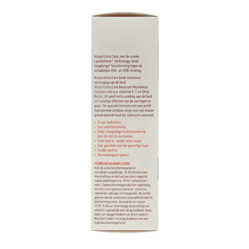 Vision Extra Care SPF50 biedt naast langdurige zonbescherming voor intensieve verzorging van de huid. Vision Extra Care bevat een Nutriboost Complex met o.a. vitamine E, C en Shea Butter, die extra voeding geeft aan de huid om nadelige effecten van de zon tegen te gaan.
