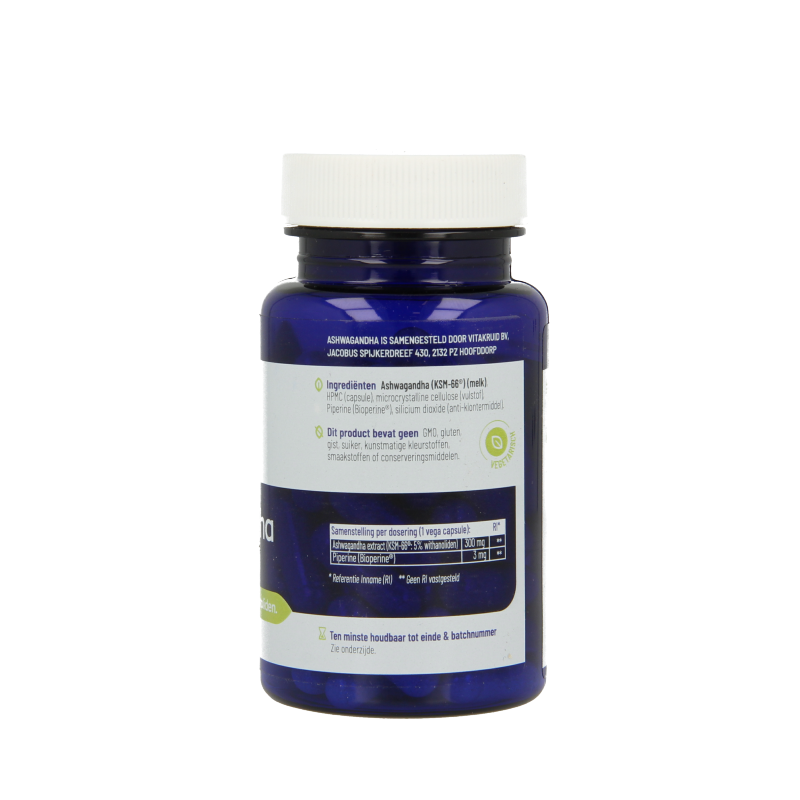 Ashwagandha (KSM-66®) (MELK), HPMC (capsule), microcrystalline cellulose (vulstof), Piperine (Bioperine®), silicium dioxide (anti-klontermiddel)