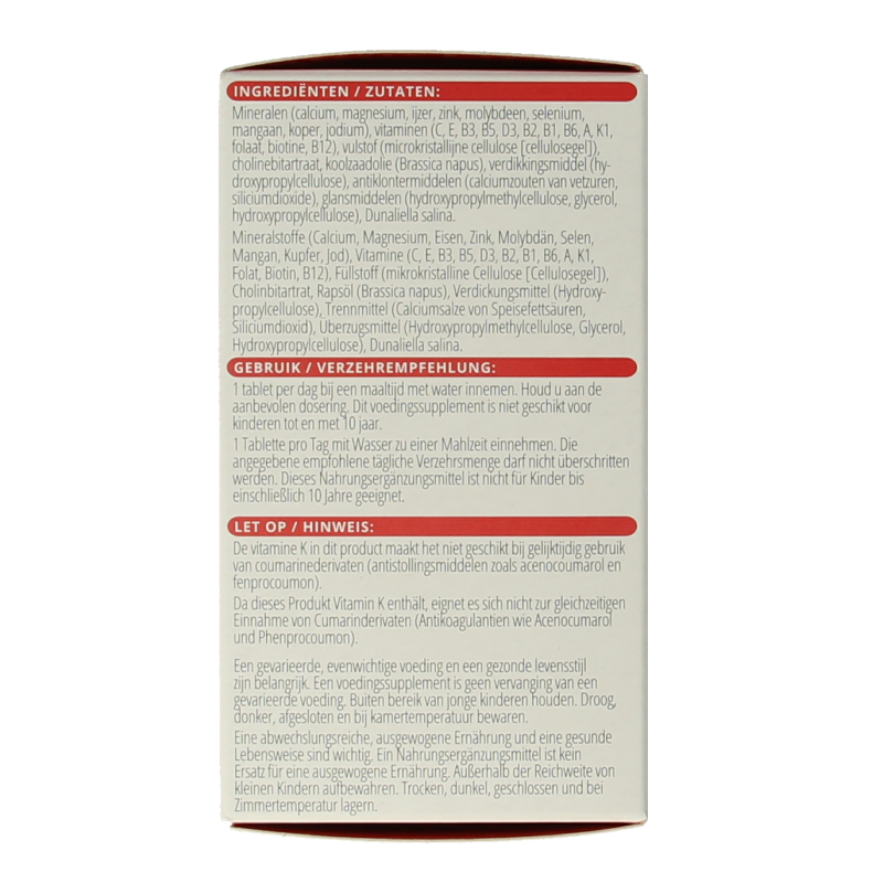 De formule bevat ook 30 mcg vitamine K1 én 60 mcg vitamine K2. Vitamine K1 wordt hoofdzakelijk door de lever opgenomen terwijl vitamine K2 veel meer over de lichaamsweefsels wordt verdeeld. Vitamine K2 heeft een veel hogere biologische beschikbaarheid en is effectiever in het bereiken van een optimale vitamine K-status. Vitamine K is belangrijk voor de bloedstollingsfunctie, maar met name vitamine K2 is belangrijk voor het activeren van specifieke vitamine K-afhankelijke enzymen die ervoor zorgen dat calcium op juiste plek terecht komt, in de botten.