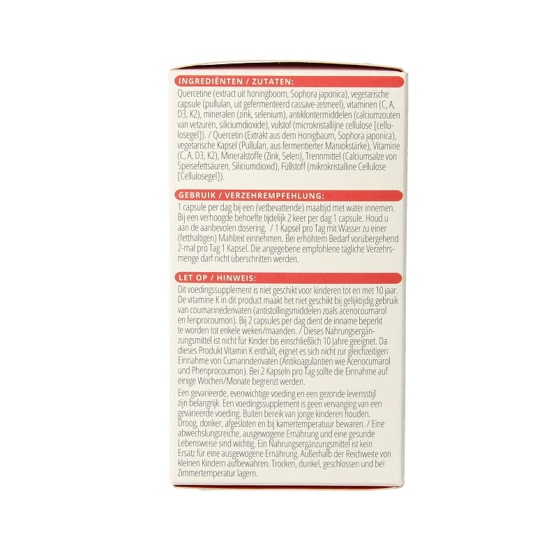 Quercetine (extract uit honingboom, Sophora japonica, bloem), plantaardige capsule (pullulan, uit gefermenteerd cassave-zetmeel), vitaminen (C, A, D3, K2), vulstof (microkristallijne cellulose [cellulosegel]), mineralen (zink, selenium), antiklontermiddelen (calciumzouten van vetzuren, siliciumdioxide).