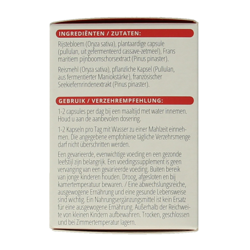 Rijstebloem (Oryza sativa), plantaardige capsule (pullulan, uit gefermenteerd cassave-zetmeel), Frans maritiem pijnboomschorsextract (Pinus pinaster).