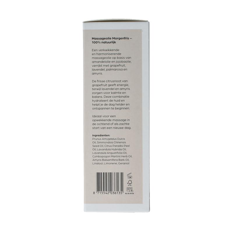 Massageolie Morgenfris met lavendel, pompelmoes, palmerosa en sandelhout in een basis van 10% jojoba en 90% amandelolie.