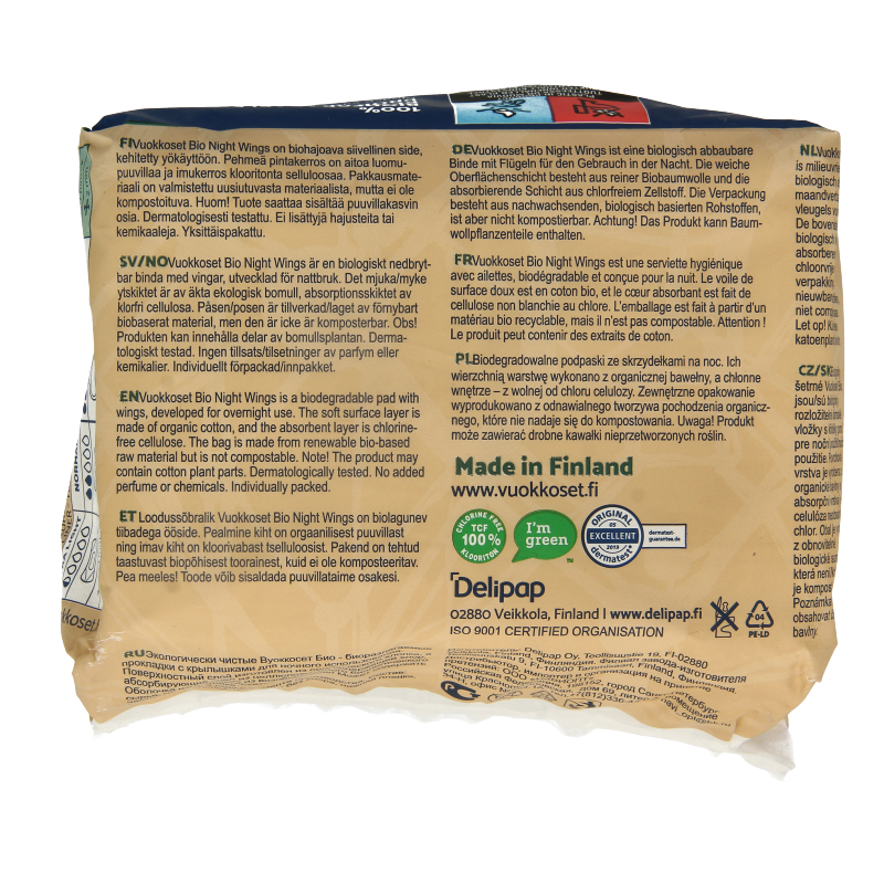Het Vuokkoset Maandverband Night wings is gemaakt van 100% biologische materiaal. De buitenlaag is gemaakt van organisch katoen en de binnenlaag enkel van pure cellulose, 100% chloorvrij (geen SAP), uit gecertificeerde Scandinavische bossen. Dit betekent dat het maandverband biologisch afbreekbaar en composteerbaar is. Zelfs aan de verpakking is gedacht. Deze is gemaakt van ‘’biobased’’ materiaal, composteerbaar en recyclebaar (afkomstig uit suikerriet).