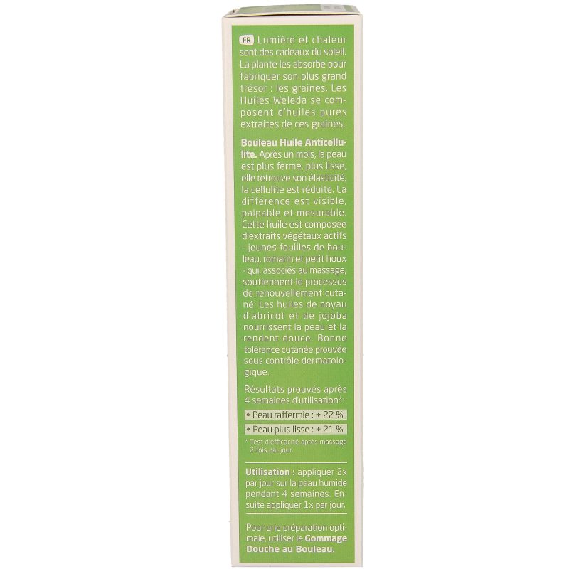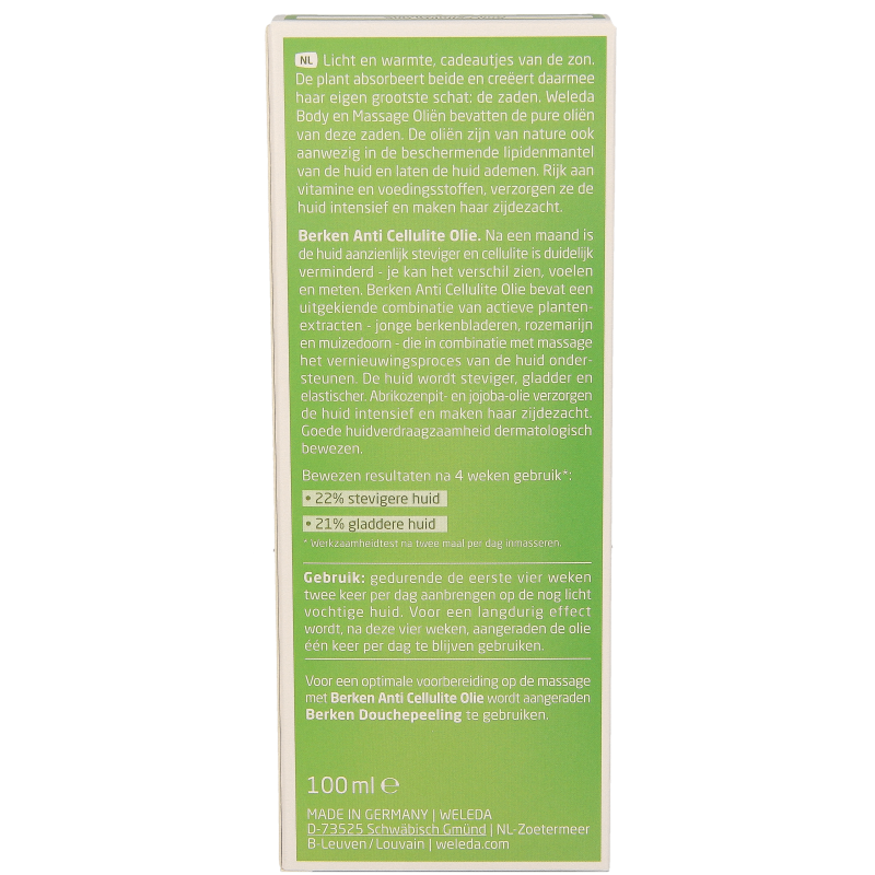 Berken Anti Cellulite Olie bevat een uitgekiende combinatie van actieve plantenextracten die de vetafbraak in de onderste huidlagen stimuleren en de afvoer van afvalstoffen en vocht activeren. De tarwekiemolie en het olie-extract van biologische rozemarijn bevorderen de doorbloeding en ondersteunen het herstellend vermogen van de huid en het bindweefsel. Bewezen effectief (+22% soepelere huid – test bij 4 weken lang 2x dagelijks gebruik).