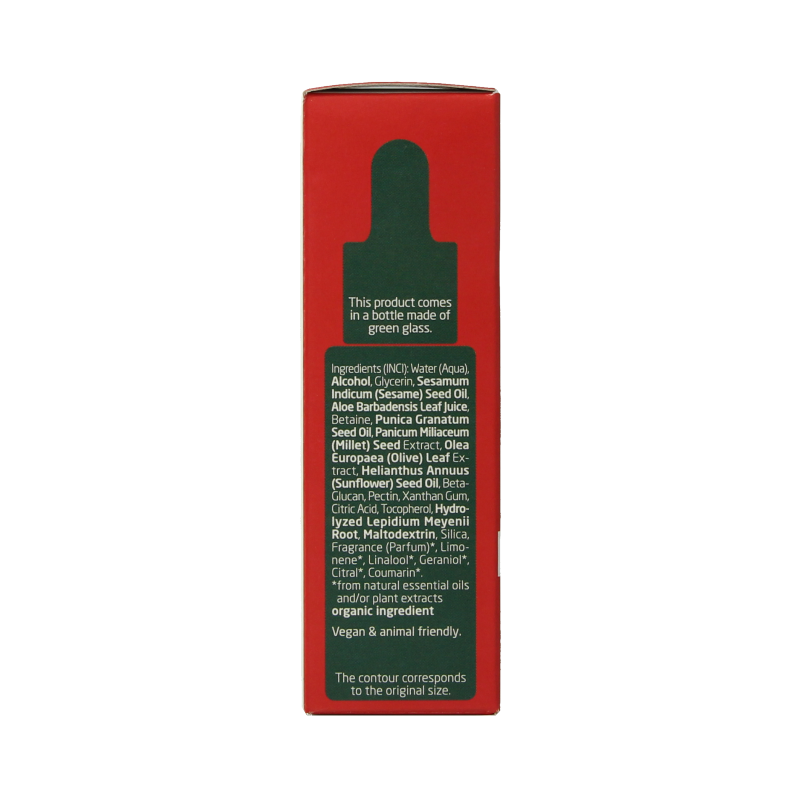 Celversterkende formule met biologische granaatappel en maca-peptiden die de celvernieuwing stimuleren en beschermen tegen vrije radicalen. Het serum is ontwikkeld als aanvullende verzorging op de dag- en nachtcrème. Maakt de huid zichtbaar steviger en stralender, vermindert rimpels en zorgt voor een onmiddellijke hydratatie-boost die lang aanhoudt. Resultaat: de huid wordt intensief gehydrateerd en voelt zachter en gladder aan.
