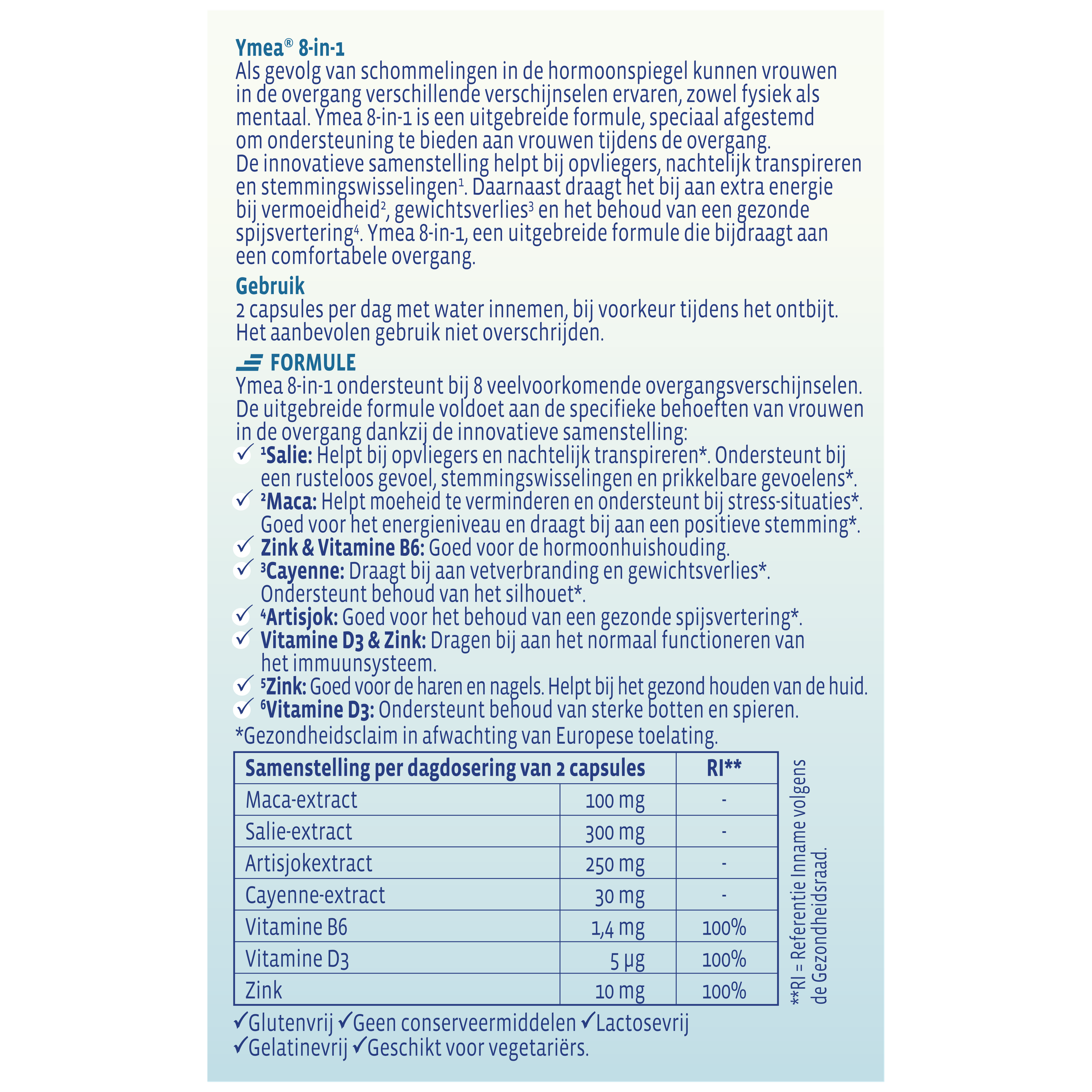 Als gevolg van schommelingen in de hormoonspiegel kunnen vrouwen in de overgang verschillende verschijnselen ervaren, zowel fysiek als mentaal. Ymea 8-in-1 is een uitgebreide formule, speciaal afgestemd om ondersteuning te bieden aan vrouwen tijdens de overgang. De innovatieve samenstelling helpt bij opvliegers, nachtelijk transpireren en stemmingswisselingen¹. Daarnaast draagt het bij aan extra energie bij vermoeidheid², gewichtsverlies³ en het behoud van een gezonde spijsvertering⁴. Ymea 8-in-1, een uitgebreide formule die bijdraagt aan een comfortabele overgang.Ymea 8-in-1 helpt bij 8 veelvoorkomende overgangsverschijnselen.