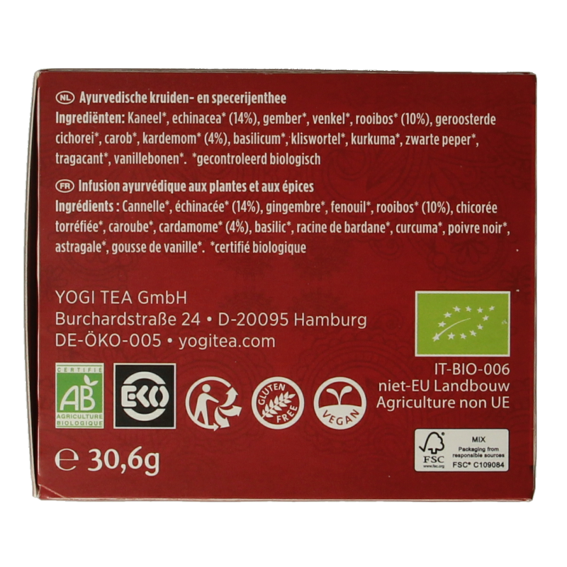 Kaneel*, echinacea* (14%), gember*, venkel*, rooibos* (10%), geroosterde cichorei*, carob*, kardemom* (4%), basilicum*, kliswortel*, zwarte peper*, kurkuma*, tragacant*, vanillebonen*.