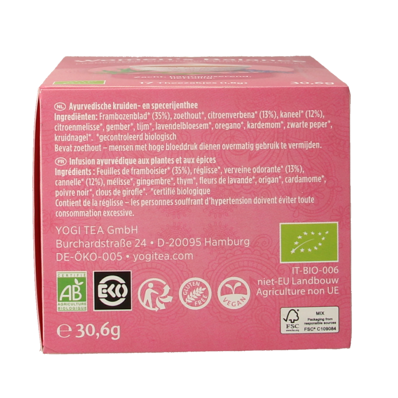 Frambozenblad* 35%, zoethout*, citroenverbena* 13%, kaneel* 12%, citroenmelisse*, gember*, tijm*, lavendelbloesem*, oregano*, kardemom*, zwarte peper*, kruidnagel*