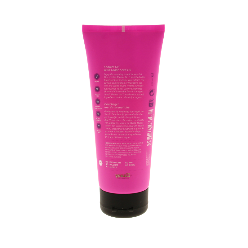 Geniet van de weldadige douchegel van Youall. Deze heerlijk geurende douchegel is verrijkt met Druivenpitolie en Aloë Vera-extract. De parfum combinatie van Mandarin, Jasmin en White Musks creëert een verrukkelijk bouquet. Youall Luxury Experience douchegel is geschikt voor alle huidtypen. Youall douchegel is gemaakt met natuurlijke ingrediënten en is geschikt voor vegans.